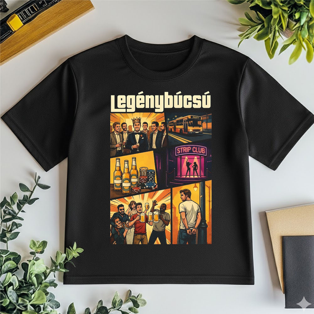 Ha a vőlegény imádja a videójátékokat, vagy csak egy igazán látványos és vicces pólót kerestek az utolsó „szingli” bevetésre, ez a GTA stílusú póló a legjobb választás. A grafika a klasszikus játékborítók hangulatát hozza el: sörök, pókerzsetonok, party busz és az elmaradhatatlan éjszakai kalandok képei állnak össze egy „Legénybúcsú” felirat alatt.